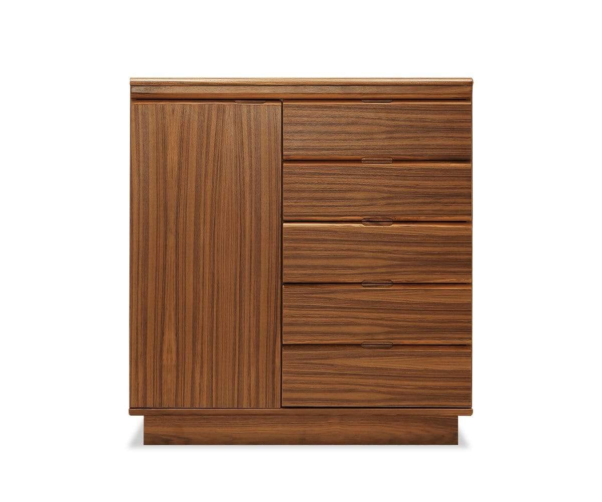 The Anisa high chest offers plenty of storage and an eye-catching design. This piece is crafted from a mix of solid teak and teak veneers and features a natural finish that allows the wood grain to shine through. Five large drawers and a cabinet with shelving ensure space for your wardrobe.