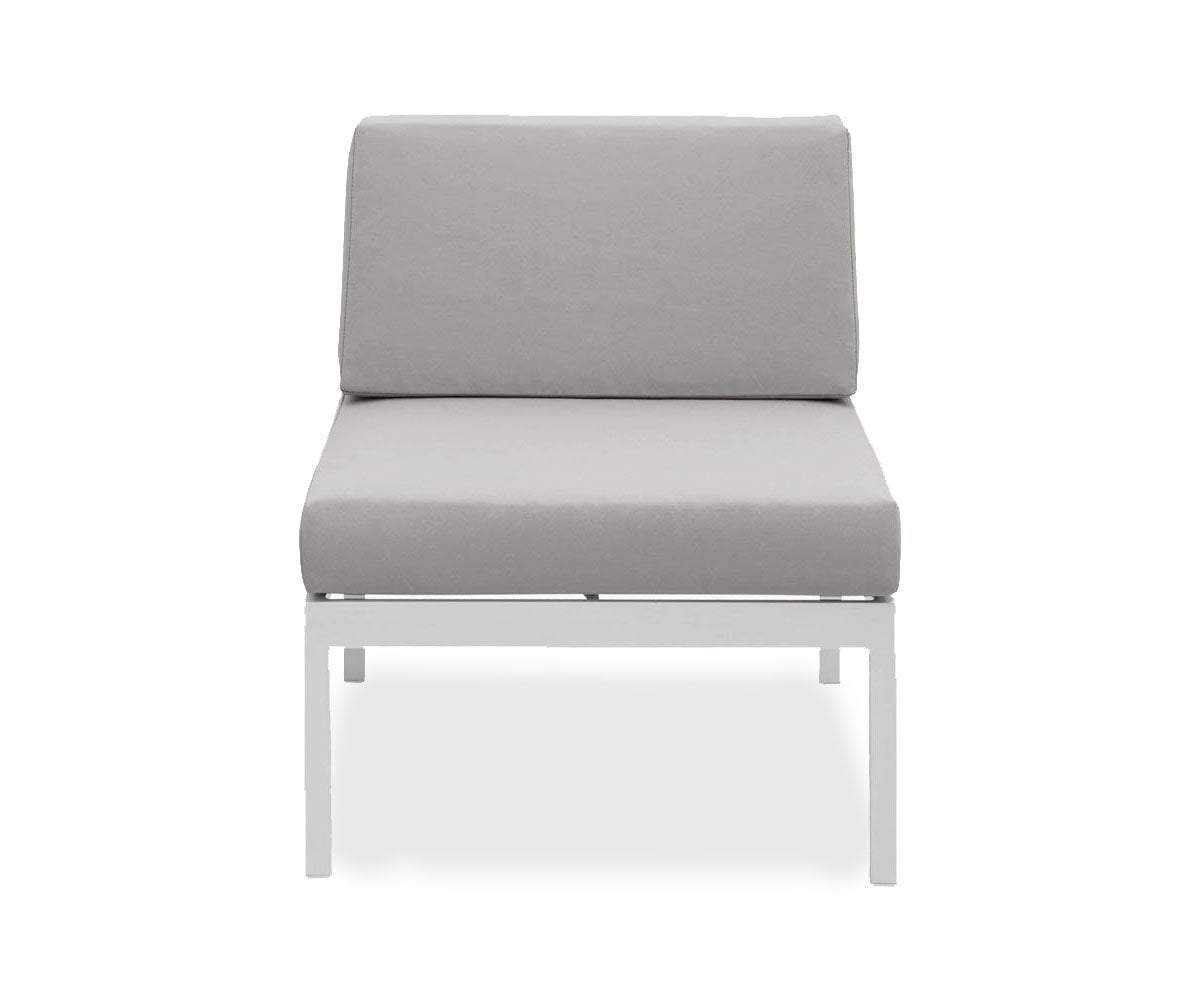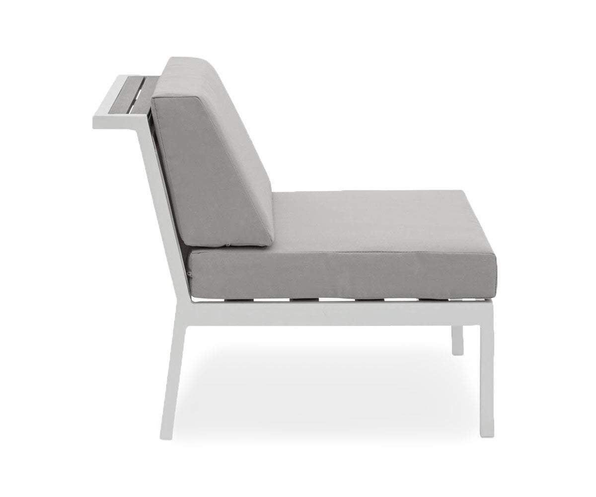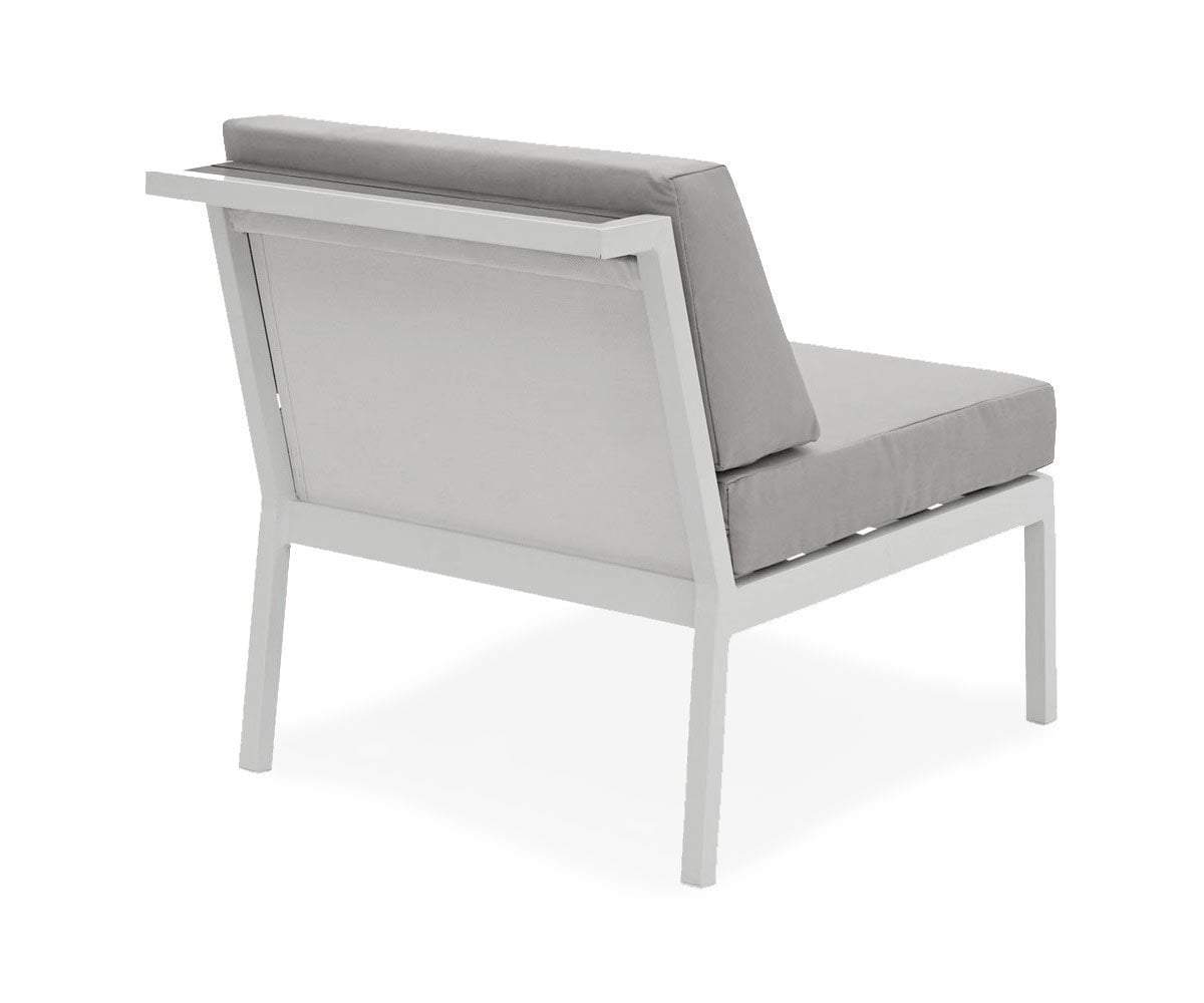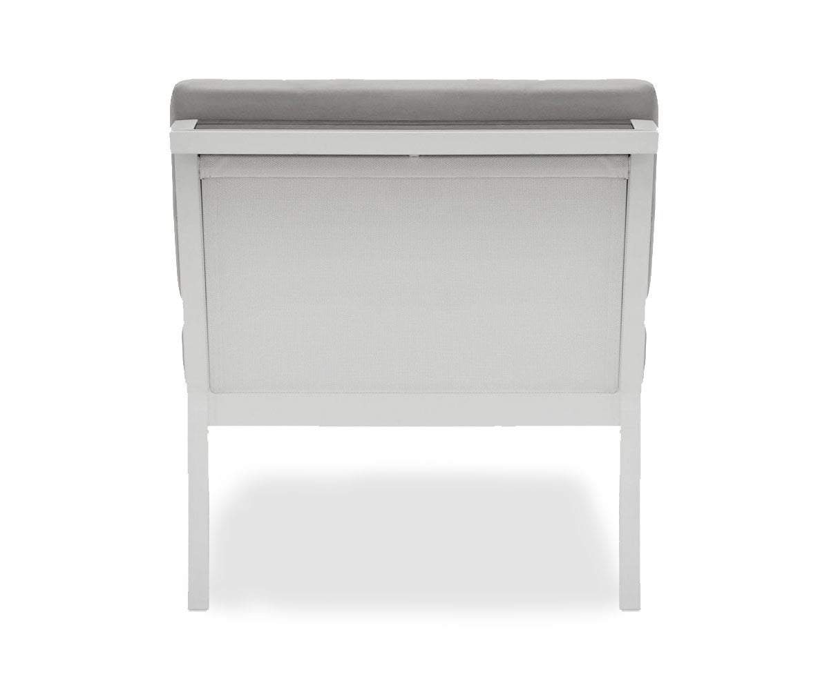 The Aurora armless chair is the perfect piece to complete your outdoor seating arrangement. It has a clean, contemporary feel, thanks to the neutral shade of the powder coated frame and subtle resin-wood details. The finishing touches are the cushions, which are wrapped in grey Olefin outdoor fabric. Olefin is a high-performance material that's water-repellent, stain-resistant and mildew-resistant. It also has a powerful color fastness rating to resist fading from sun and weather exposure.