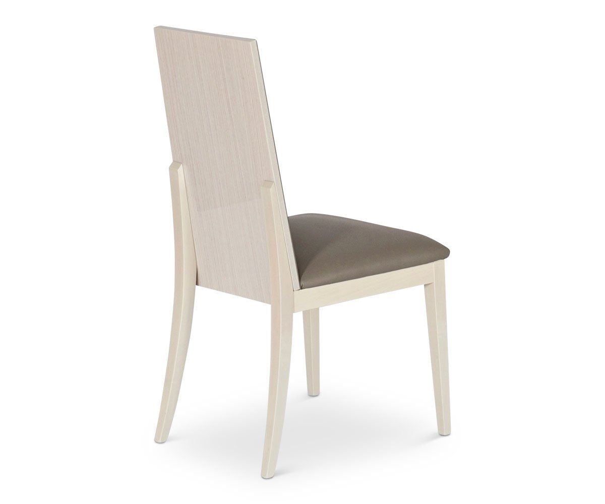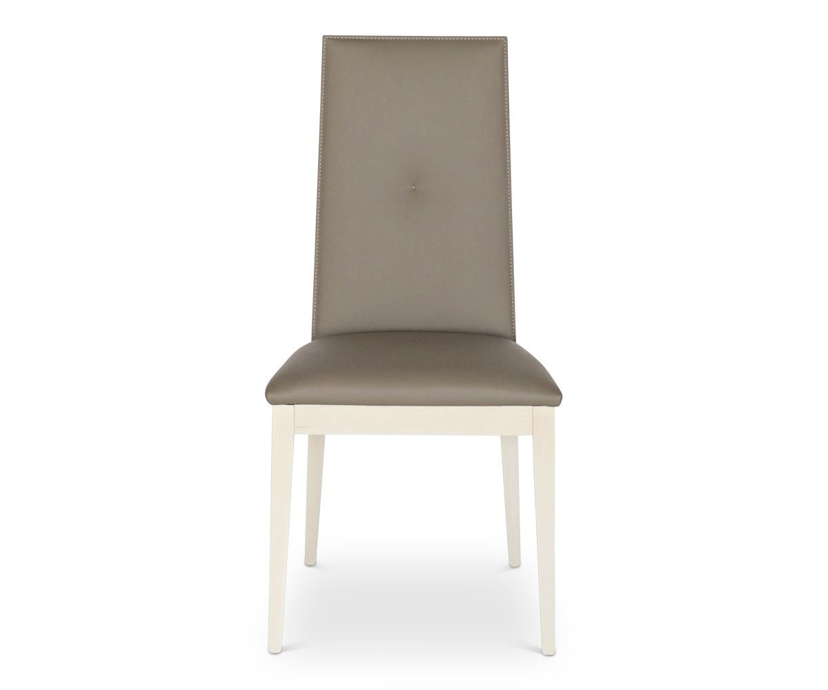 Fine details define the Monchiaro dining chair. The back of the chair displays the elegant light grey koto wood veneer in a high gloss finish while the fine upholstery boasts a padded seat with contrast stitching and a single button tuft on the backrest.