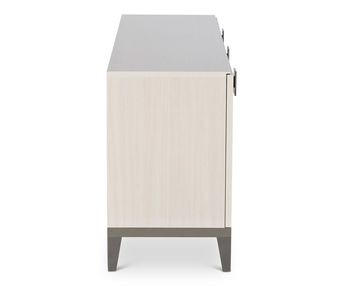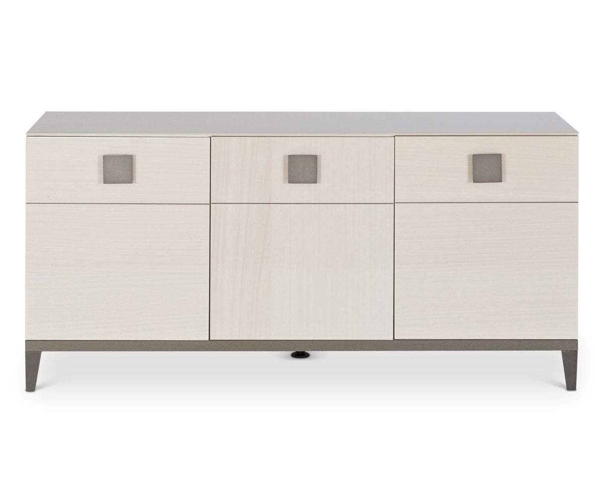 Poised to add beauty and functionality to your dining room, the Monchiaro sideboard is a spacious storage solution crafted from light grey koto wood veneer in a high gloss finish. A contrasting raised metal base and generous square handles finish the look. This contemporary design incorporates the look of three drawers that each become part of three doors that open outward to reveal ample cabinet space inside.