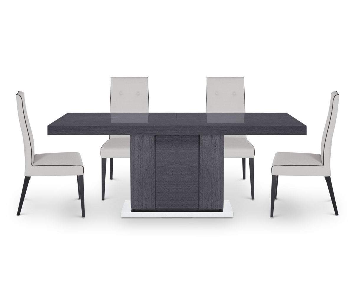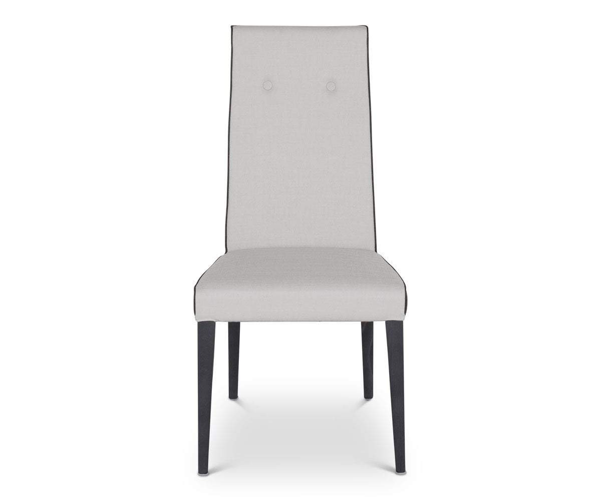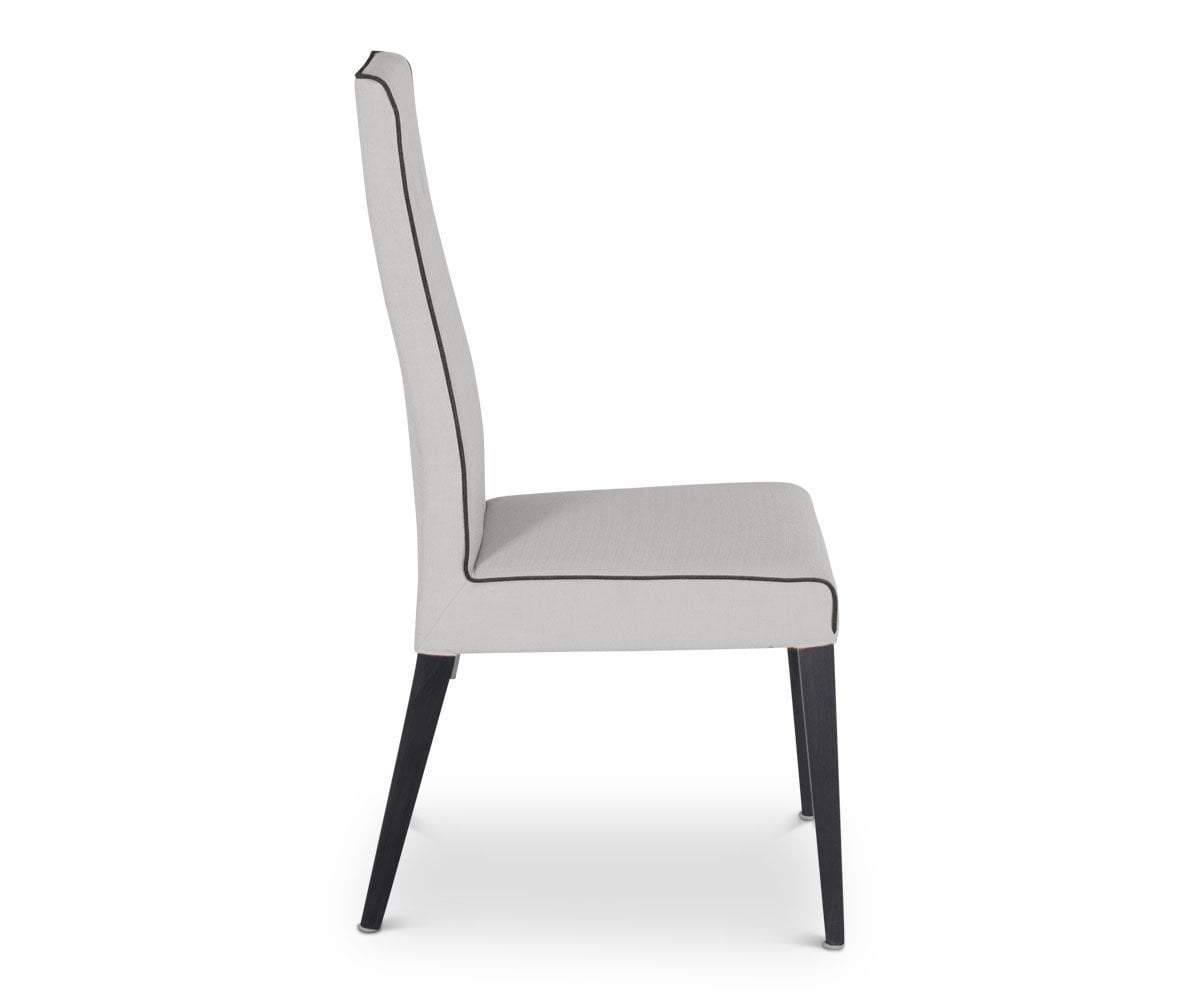 The Mondiana dining chair is upholstered in a light grey fabric with a contrasting welt that coordinates with the elegant legs constructed of grey koto veneer with a high gloss finish.